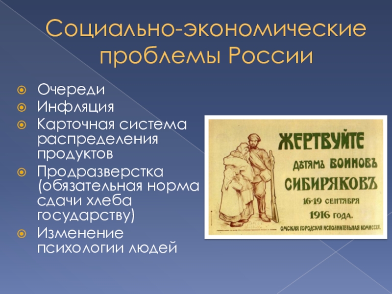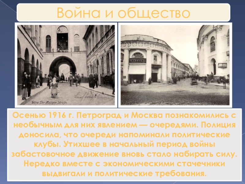 Осенью 1916 г. Петроград и Москва познакомились с необычным для них явлением — очередями. Полиция доносила, что очереди напоминали политические клубы. Утихшее в начальный период войны забастовочное движение вновь стало набирать силу. Нередко вместе с экономическими стачечники выдвигали и политические требования.