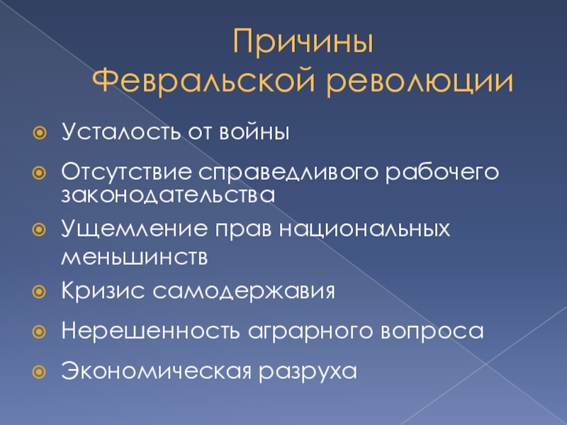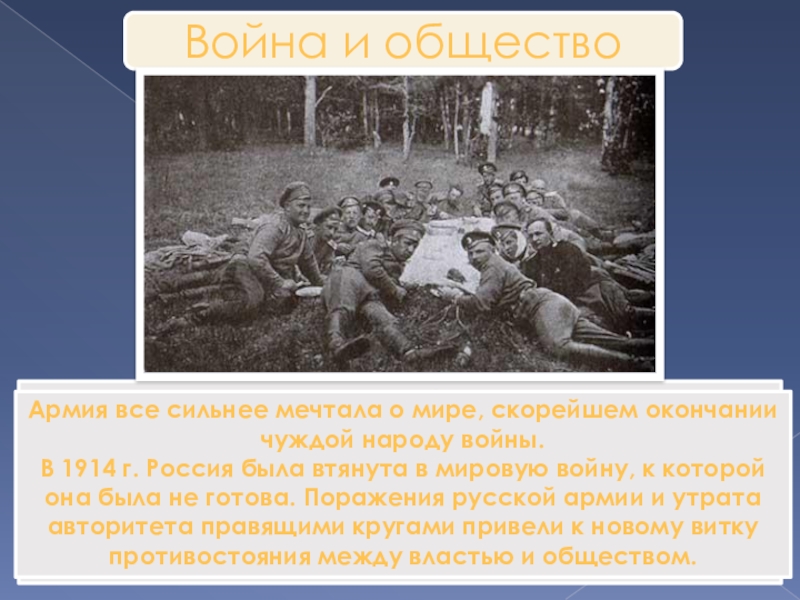 В 1914 г. Россия была втянута в мировую войну, к которой она была не готова. Поражения русской армии и утрата авторитета правящими кругами привели к новому витку противостояния между властью и обществом.