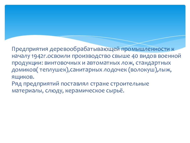 Слайд 8Предприятия деревообрабатывающей промышленности к началу 1942г.освоили производство свыше 40 видов военной