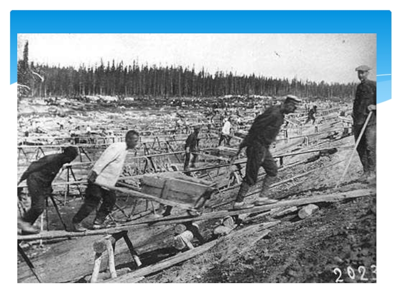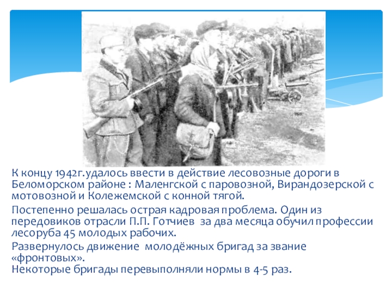 Слайд 7К концу 1942г.удалось ввести в действие лесовозные дороги в Беломорском районе