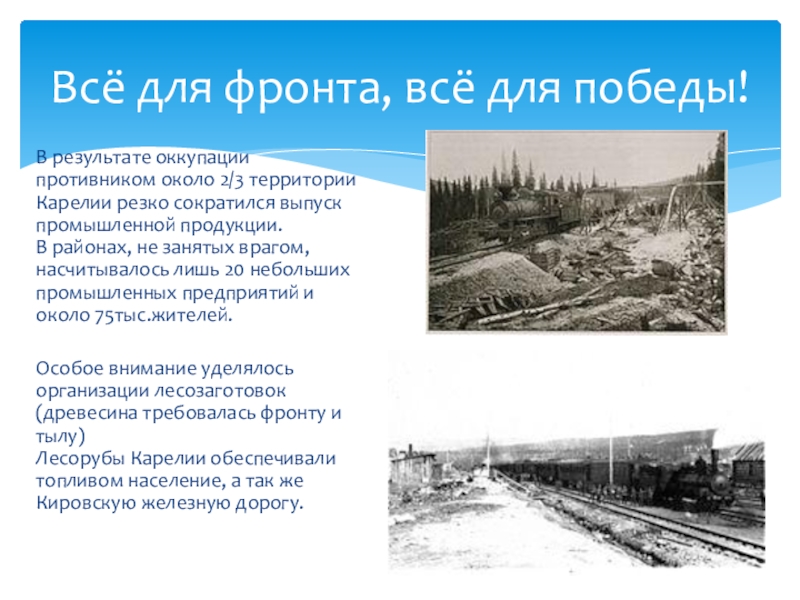 Всё для фронта, всё для победы!В результате оккупации противником около 2/3 территории Карелии резко сократился выпуск промышленной продукции. В районах, не занятых врагом, насчитывалось лишь 20 небольших промышленных предприятий и около 75тыс.жителей.Особое внимание уделялось организации лесозаготовок