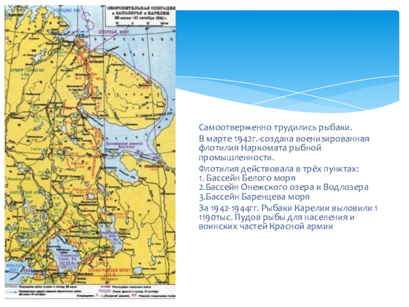 За 1942-1944гг. Рыбаки Карелии выловили 1 1190тыс. Пудов рыбы для населения и воинских частей Красной армии