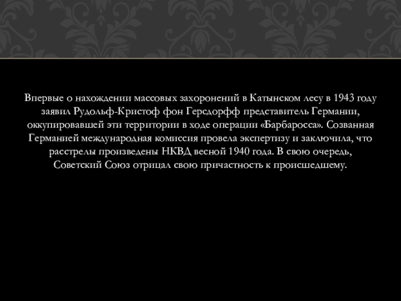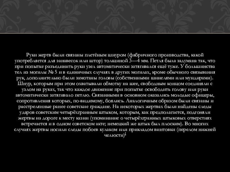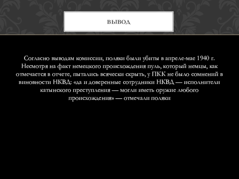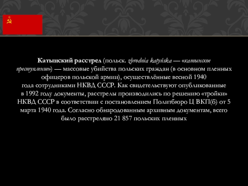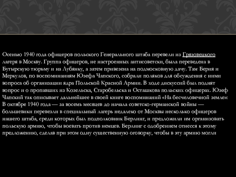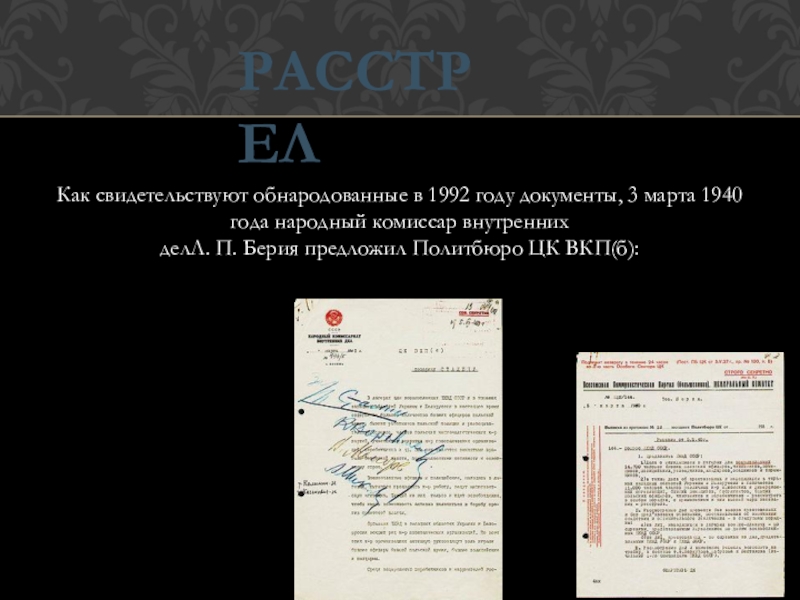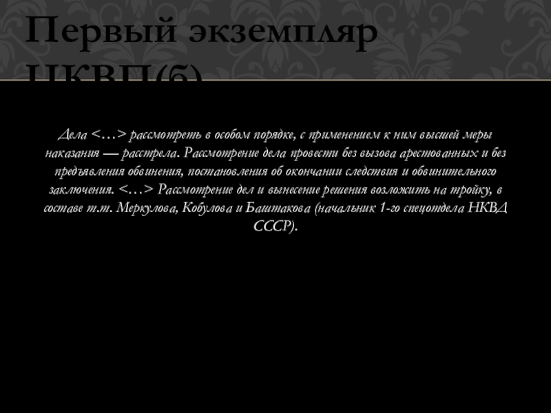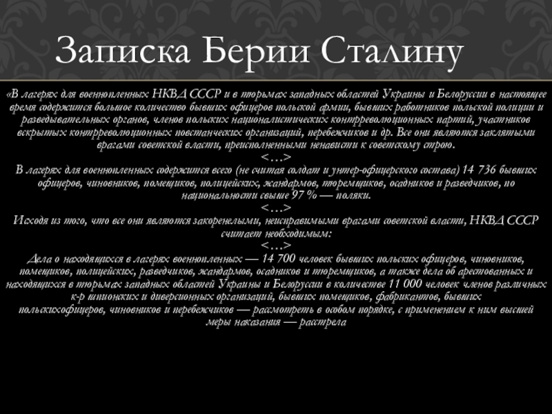 Дела о находящихся в лагерях военнопленных — 14 700 человек бывших польских офицеров, чиновников, помещиков, полицейских, разведчиков, жандармов, осадников и тюремщиков, а также дела об арестованных и находящихся в тюрьмах западных областей Украины и Белоруссии в количестве 11 000 человек членов различных к-р шпионских и диверсионных организаций, бывших помещиков, фабрикантов, бывших польскихофицеров, чиновников и перебежчиков — рассмотреть в особом порядке, с применением к ним высшей меры наказания — расстрела
