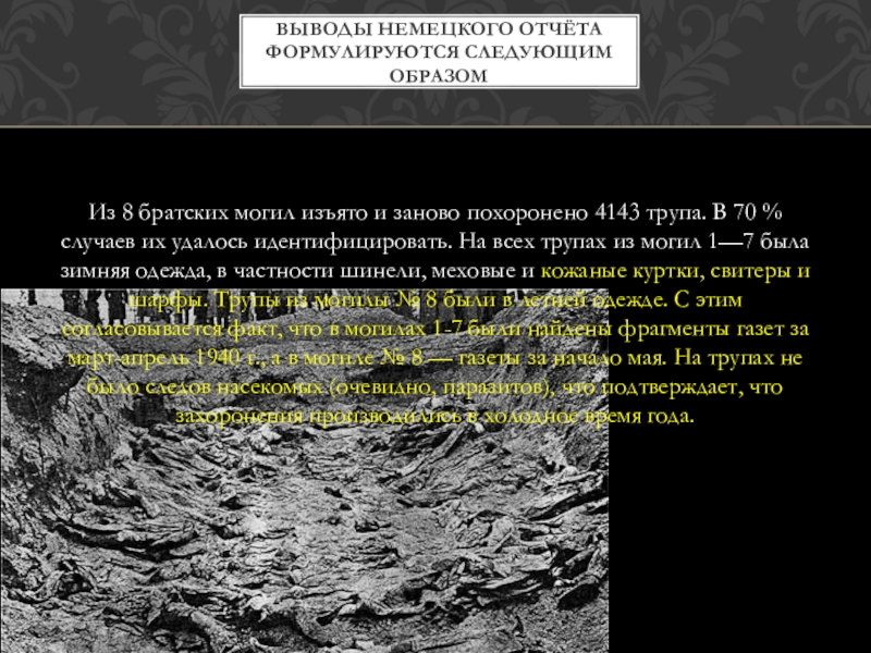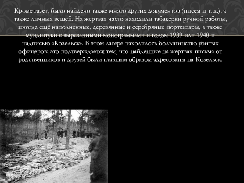 В лагерях для военнопленных содержится всего (не считая солдат и унтер-офицерского состава) 14 736 бывших офицеров, чиновников, помещиков, полицейских, жандармов, тюремщиков, осадников и разведчиков, по национальности свыше 97 % — поляки.