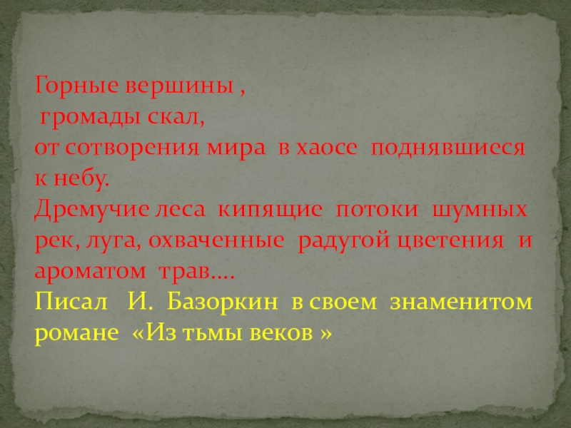 к небу. Дремучие леса кипящие потоки шумных рек, луга, охваченные радугой цветения и ароматом трав…. Писал И. Базоркин в своем знаменитом романе «Из тьмы веков »