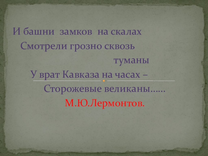 И башни замков на скалах Смотрели грозно сквозь туманы У врат Кавказа на
