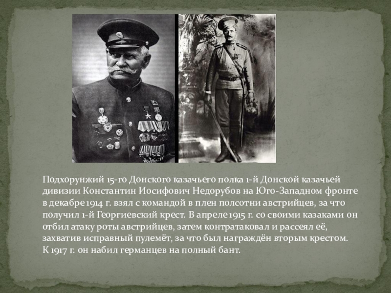 Слайд 34Подхорунжий 15-го Донского казачьего полка 1-й Донской казачьей дивизии Константин Иосифович