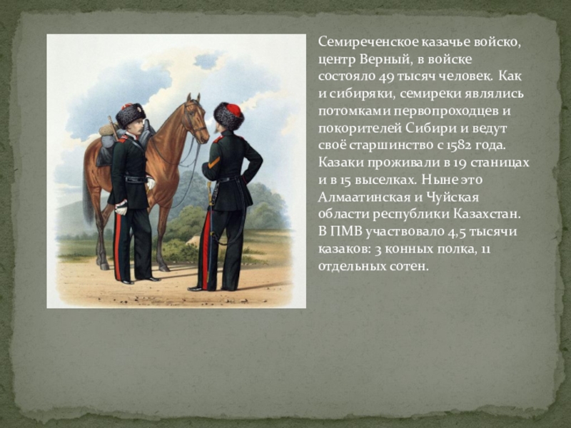 Слайд 11Семиреченское казачье войско, центр Верный, в войске состояло 49 тысяч человек.