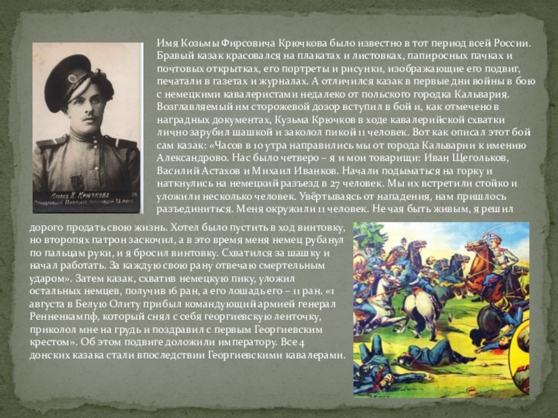 Бравый казак красовался на плакатах и листовках, папиросных пачках и почтовых открытках, его портреты и рисунки, изображающие его подвиг, печатали в газетах и журналах. А отличился казак в первые дни войны в бою с немецкими кавалеристами недалеко от польского городка Кальвария. Возглавляемый им сторожевой дозор вступил в бой и, как отмечено в наградных документах, Кузьма Крючков в ходе кавалерийской схватки лично зарубил шашкой и заколол пикой 11 человек. Вот как описал этот бой сам казак: «Часов в 10 утра направились мы от города Кальварии к имению Александрово. Нас было четверо – я и мои товарищи: Иван Щегольков, Василий Астахов и Михаил Иванков. Начали подыматься на горку и наткнулись на немецкий разъезд в 27 человек. Мы их встретили стойко и уложили несколько человек. Увёртываясь от нападения, нам пришлось разъединиться. Меня окружили 11 человек. Не чая быть живым, я решил