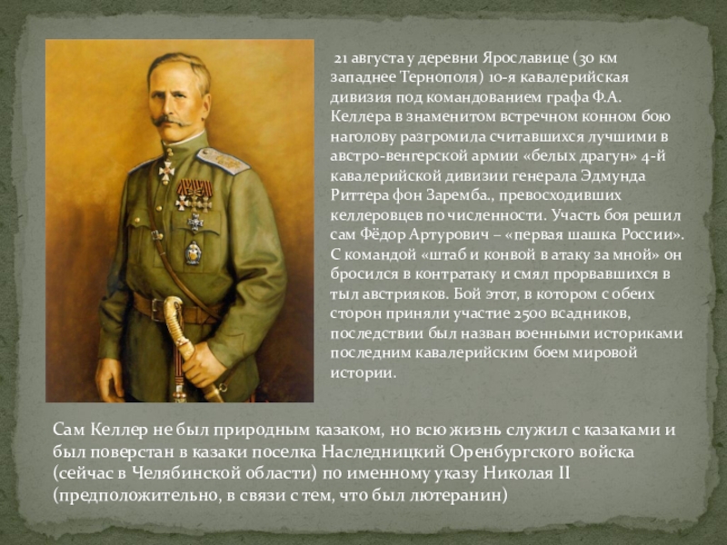 кавалерийская дивизия под командованием графа Ф.А. Келлера в знаменитом встречном конном бою наголову разгромила считавшихся лучшими в австро-венгерской армии «белых драгун» 4-й кавалерийской дивизии генерала Эдмунда Риттера фон Заремба., превосходивших келлеровцев по численности. Участь боя решил сам Фёдор Артурович – «первая шашка России». С командой «штаб и конвой в атаку за мной» он бросился в контратаку и смял прорвавшихся в тыл австрияков. Бой этот, в котором с обеих сторон приняли участие 2500 всадников, последствии был назван военными историками последним кавалерийским боем мировой истории.