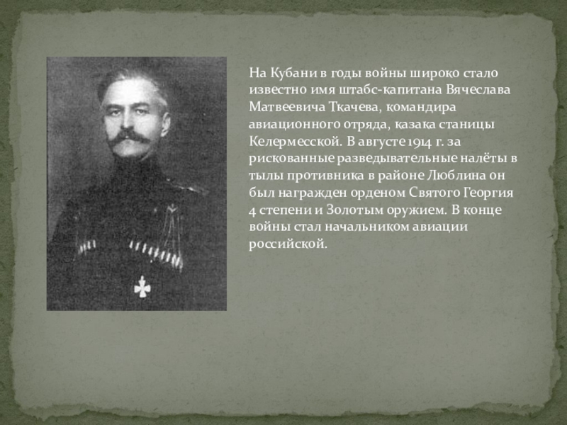 Матвеевича Ткачева, командира авиационного отряда, казака станицы Келермесской. В августе 1914 г. за рискованные разведывательные налёты в тылы противника в районе Люблина он был награжден орденом Святого Георгия 4 степени и Золотым оружием. В конце войны стал начальником авиации российской.
