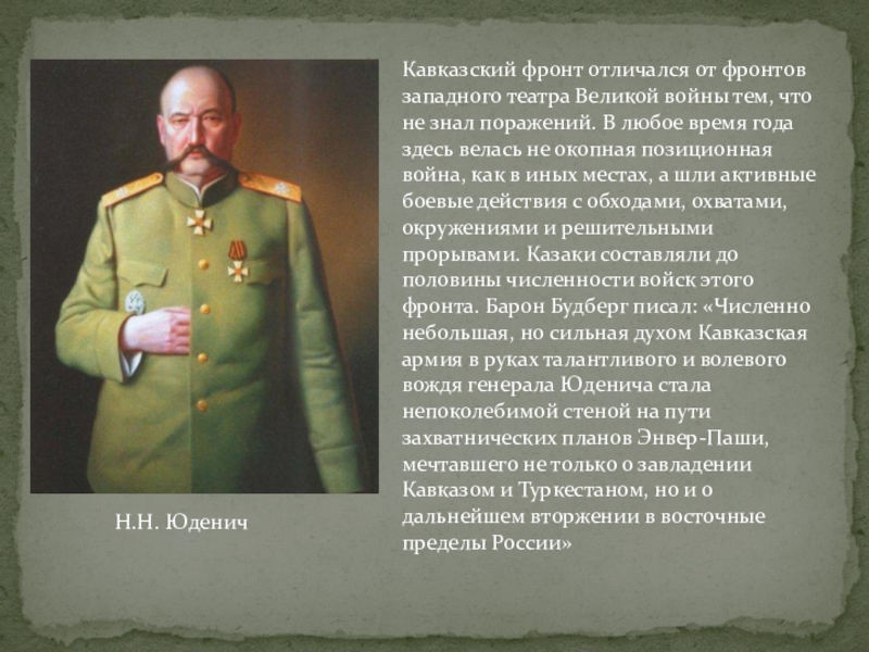 не знал поражений. В любое время года здесь велась не окопная позиционная война, как в иных местах, а шли активные боевые действия с обходами, охватами, окружениями и решительными прорывами. Казаки составляли до половины численности войск этого фронта. Барон Будберг писал: «Численно небольшая, но сильная духом Кавказская армия в руках талантливого и волевого вождя генерала Юденича стала непоколебимой стеной на пути захватнических планов Энвер-Паши, мечтавшего не только о завладении Кавказом и Туркестаном, но и о дальнейшем вторжении в восточные пределы Poссии»