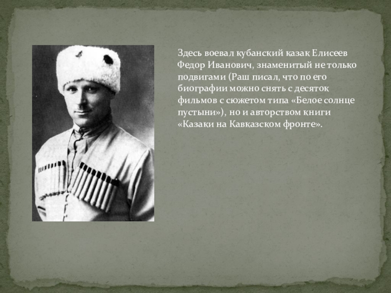 Слайд 32Здесь воевал кубанский казак Елисеев Федор Иванович, знаменитый не только подвигами