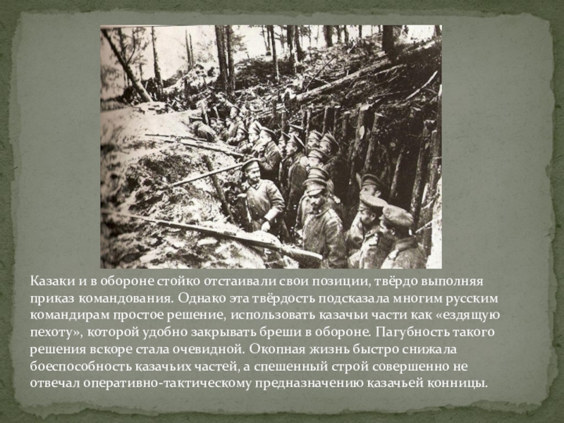 командования. Однако эта твёрдость подсказала многим русским командирам простое решение, использовать казачьи части как «ездящую пехоту», которой удобно закрывать бреши в обороне. Пагубность такого решения вскоре стала очевидной. Окопная жизнь быстро снижала боеспособность казачьих частей, а спешенный строй совершенно не отвечал оперативно-тактическому предназначению казачьей конницы.