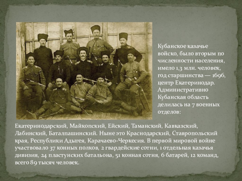 края, Республики Адыгея, Карачаево-Черкесия. В первой мировой войне участвовало 37 конных полков, 2 гвардейские сотни, 1 отдельная казачья дивизия, 24 пластунских батальона, 51 конная сотня, 6 батарей, 12 команд, всего 89 тысяч человек.