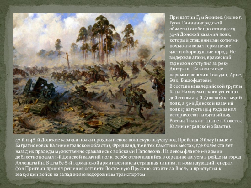 Прейсиш-Эйлау (ныне г. Багратионовск Калининградской области), Фридланд, т.е в тех памятных местах, где более ста лет назад их прадеды мужественно сражались с войсками Наполеона. На левом фланге 1-й армии доблестно воевал 1-й Донской казачий полк, особо отличившийся в середине августа в рейде на город Алленштайн. В штабе 8-й германской армии возникла страшная паника, и командующий генерал фон Притвиц принял решение оставить Восточную Пруссию, отойти за Вислу и приступил к эвакуации войск на запад железнодорожным транспортом