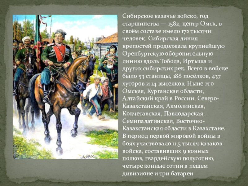 Слайд 10Сибирское казачье войско, год старшинства — 1582, центр Омск, в своём