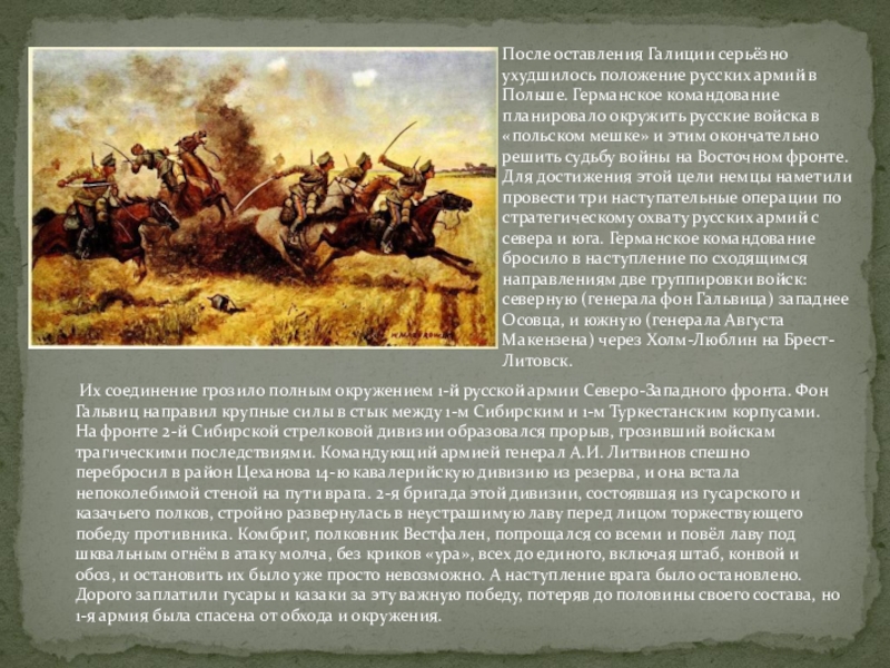 Фон Гальвиц направил крупные силы в стык между 1-м Сибирским и 1-м Туркестанским корпусами. На фронте 2-й Сибирской стрелковой дивизии образовался прорыв, грозивший войскам трагическими последствиями. Командующий армией генерал А.И. Литвинов спешно перебросил в район Цеханова 14-ю кавалерийскую дивизию из резерва, и она встала непоколебимой стеной на пути врага. 2-я бригада этой дивизии, состоявшая из гусарского и казачьего полков, стройно развернулась в неустрашимую лаву перед лицом торжествующего победу противника. Комбриг, полковник Вестфален, попрощался со всеми и повёл лаву под шквальным огнём в атаку молча, без криков «ура», всех до единого, включая штаб, конвой и обоз, и остановить их было уже просто невозможно. А наступление врага было остановлено. Дорого заплатили гусары и казаки за эту важную победу, потеряв до половины своего состава, но 1-я армия была спасена от обхода и окружения.