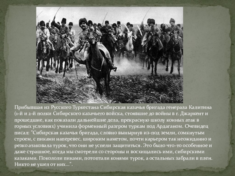 2-й полки Сибирского казачьего войска, стоявшие до войны в г. Джаркент и прошедшие, как показали дальнейшие дела, прекрасную школу конных атак в горных условиях) учинила форменный разгром туркам под Ардаганом. Очевидец писал: "Сибирская казачья бригада, словно вынырнув из-под земли, сомкнутым строем, с пиками наперевес, широким наметом, почти карьером так неожиданно и резко атаковала турок, что они не успели защититься. Это было что-то особенное и даже страшное, когда мы смотрели со стороны и восхищались ими, сибирскими казаками. Покололи пиками, потоптали конями турок, а остальных забрали в плен. Никто не ушел от них...".