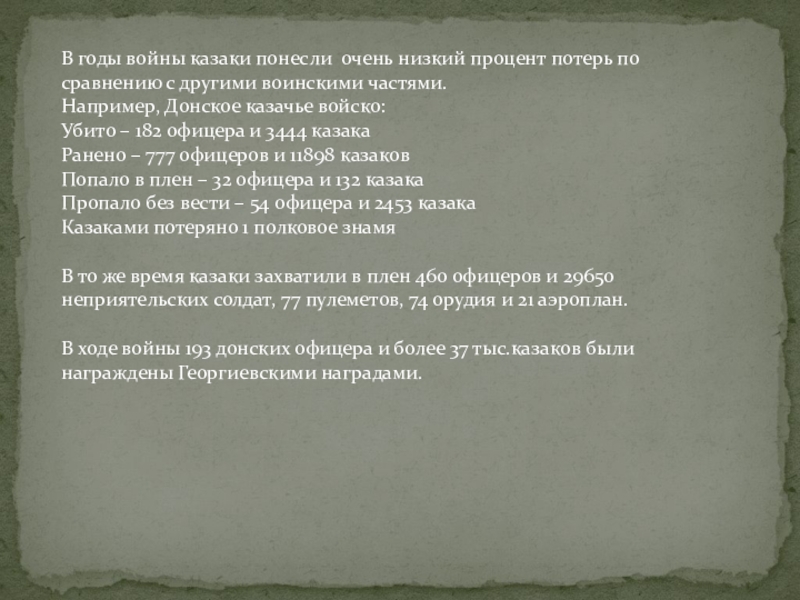 Слайд 38В годы войны казаки понесли очень низкий процент потерь по сравнению