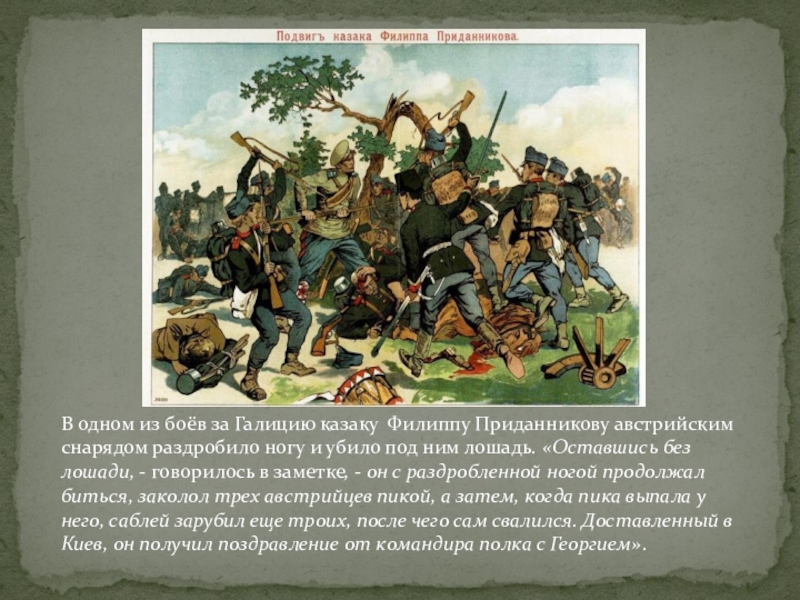 Слайд 37В одном из боёв за Галицию казаку Филиппу Приданникову австрийским снарядом