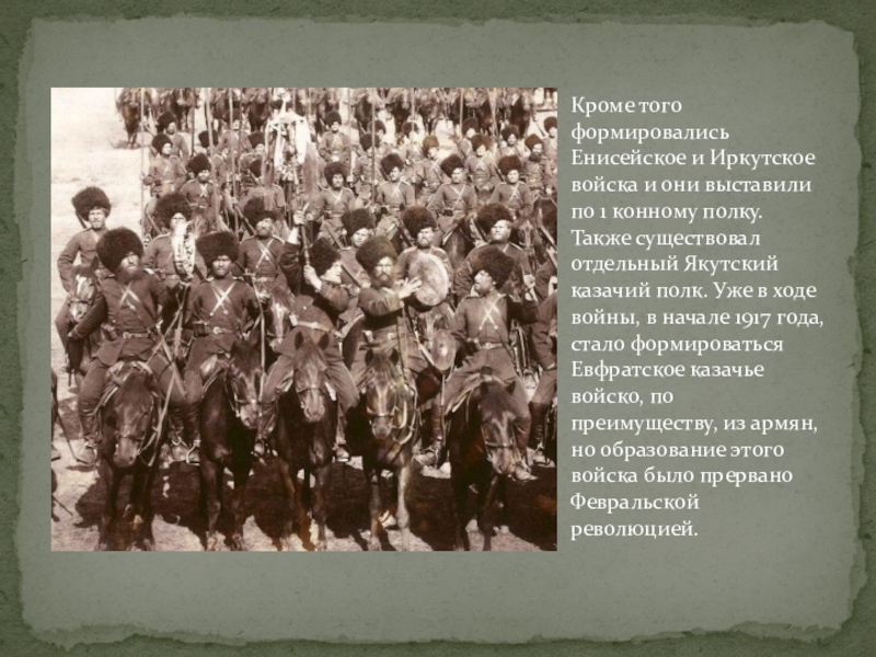 1 конному полку. Также существовал отдельный Якутский казачий полк. Уже в ходе войны, в начале 1917 года, стало формироваться Евфратское казачье войско, по преимуществу, из армян, но образование этого войска было прервано Февральской революцией.