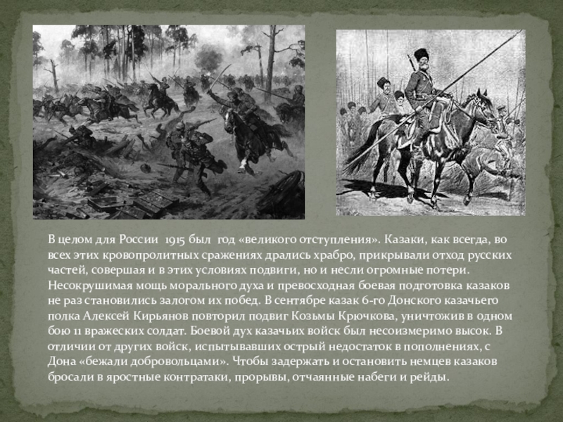Слайд 23В целом для России 1915 был год «великого отступления». Казаки, как