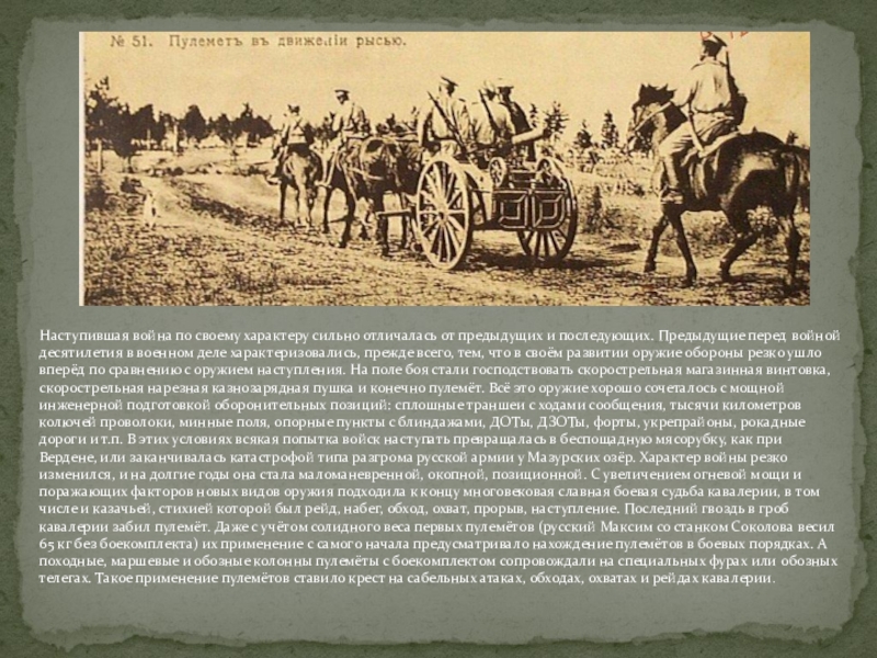 Предыдущие перед войной десятилетия в военном деле характеризовались, прежде всего, тем, что в своём развитии оружие обороны резко ушло вперёд по сравнению с оружием наступления. На поле боя стали господствовать скорострельная магазинная винтовка, скорострельная нарезная казнозарядная пушка и конечно пулемёт. Всё это оружие хорошо сочеталось с мощной инженерной подготовкой оборонительных позиций: сплошные траншеи с ходами сообщения, тысячи километров колючей проволоки, минные поля, опорные пункты с блиндажами, ДОТы, ДЗОТы, форты, укрепрайоны, рокадные дороги и т.п. В этих условиях всякая попытка войск наступать превращалась в беспощадную мясорубку, как при Вердене, или заканчивалась катастрофой типа разгрома русской армии у Мазурских озёр. Характер войны резко изменился, и на долгие годы она стала маломаневренной, окопной, позиционной. С увеличением огневой мощи и поражающих факторов новых видов оружия подходила к концу многовековая славная боевая судьба кавалерии, в том числе и казачьей, стихией которой был рейд, набег, обход, охват, прорыв, наступление. Последний гвоздь в гроб кавалерии забил пулемёт. Даже с учётом солидного веса первых пулемётов (русский Максим со станком Соколова весил 65 кг без боекомплекта) их применение с самого начала предусматривало нахождение пулемётов в боевых порядках. А походные, маршевые и обозные колонны пулемёты с боекомплектом сопровождали на специальных фурах или обозных телегах. Такое применение пулемётов ставило крест на сабельных атаках, обходах, охватах и рейдах кавалерии.