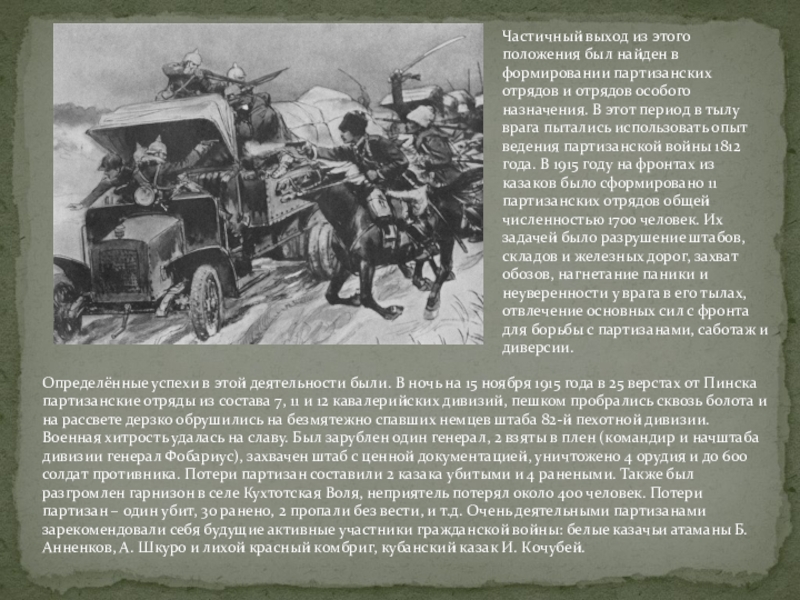 1915 года в 25 верстах от Пинска партизанские отряды из состава 7, 11 и 12 кавалерийских дивизий, пешком пробрались сквозь болота и на рассвете дерзко обрушились на безмятежно спавших немцев штаба 82-й пехотной дивизии. Военная хитрость удалась на славу. Был зарублен один генерал, 2 взяты в плен (командир и начштаба дивизии генерал Фобариус), захвачен штаб с ценной документацией, уничтожено 4 орудия и до 600 солдат противника. Потери партизан составили 2 казака убитыми и 4 ранеными. Также был разгромлен гарнизон в селе Кухтотская Воля, неприятель потерял около 400 человек. Потери партизан – один убит, 30 ранено, 2 пропали без вести, и т.д. Очень деятельными партизанами зарекомендовали себя будущие активные участники гражданской войны: белые казачьи атаманы Б. Анненков, А. Шкуро и лихой красный комбриг, кубанский казак И. Кочубей.