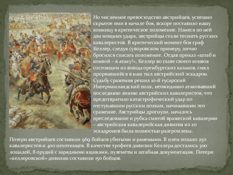 поставило нашу конницу в критическое положение. Нанеся по ней два мощных удара, австрийцы стали теснить русских кавалеристов. В критический момент боя граф Келлер, следуя суворовском примеру, лично бросился спасать положение. Отдав приказ «штаб и конвой ‒ в атаку!», Келлер во главе своего конвоя состоящим из взвода оренбургских казаков, смял прорвавшийся в наш тыл австрийский эскадрон. Судьбу сражения решил 10-й гусарский Ингерманландский полк, неожиданно атаковавший последнюю линию австрийских кавалеристов, что предотвратило катастрофический удар по отступавшим русским полкам, начинавшим это сражение. Австрийцы дрогнули, началось преследование и рубка смятой вражеской кавалерии ‒ австрийская кавалерийская дивизия из 20 эскадронов была полностью разгромлена.