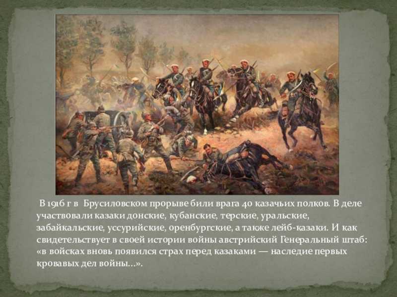 Слайд 27 В 1916 г в Брусиловском прорыве били врага 40 казачьих полков.