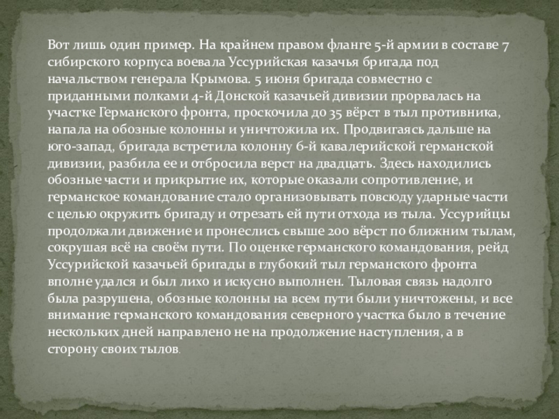 составе 7 сибирского корпуса воевала Уссурийская казачья бригада под начальством генерала Крымова. 5 июня бригада совместно с приданными полками 4-й Донской казачьей дивизии прорвалась на участке Германского фронта, проскочила до 35 вёрст в тыл противника, напала на обозные колонны и уничтожила их. Продвигаясь дальше на юго-запад, бригада встретила колонну 6-й кавалерийской германской дивизии, разбила ее и отбросила верст на двадцать. Здесь находились обозные части и прикрытие их, которые оказали сопротивление, и германское командование стало организовывать повсюду ударные части с целью окружить бригаду и отрезать ей пути отхода из тыла. Уссурийцы продолжали движение и пронеслись свыше 200 вёрст по ближним тылам, сокрушая всё на своём пути. По оценке германского командования, рейд Уссурийской казачьей бригады в глубокий тыл германского фронта вполне удался и был лихо и искусно выполнен. Тыловая связь надолго была разрушена, обозные колонны на всем пути были уничтожены, и все внимание германского командования северного участка было в течение нескольких дней направлено не на продолжение наступления, а в сторону своих тылов.