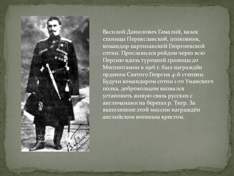 Слайд 36Василий Данилович Гамалий, казак станицы Переяславской, полковник, командир партизанской Георгиевской сотни.