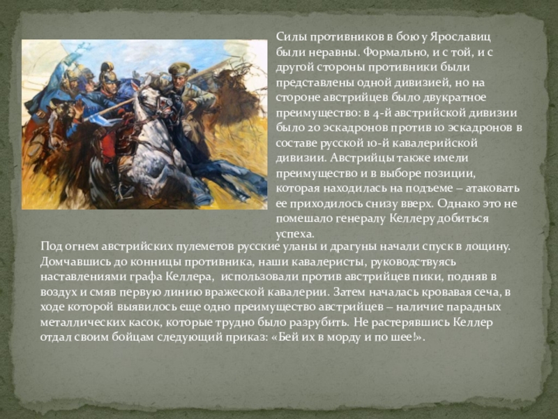 той, и с другой стороны противники были представлены одной дивизией, но на стороне австрийцев было двукратное преимущество: в 4-й австрийской дивизии было 20 эскадронов против 10 эскадронов в составе русской 10-й кавалерийской дивизии. Австрийцы также имели преимущество и в выборе позиции, которая находилась на подъеме ‒ атаковать ее приходилось снизу вверх. Однако это не помешало генералу Келлеру добиться успеха.