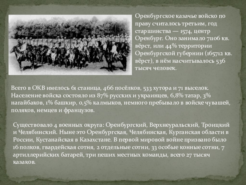 Оренбургское казачье войско по праву считалось третьим, год старшинства — 1574, центр Оренбург. Оно занимало 71106 кв. вёрст, или 44% территории Оренбургской губернии (165712 кв. вёрст), в нём насчитывалось 536 тысяч человек.