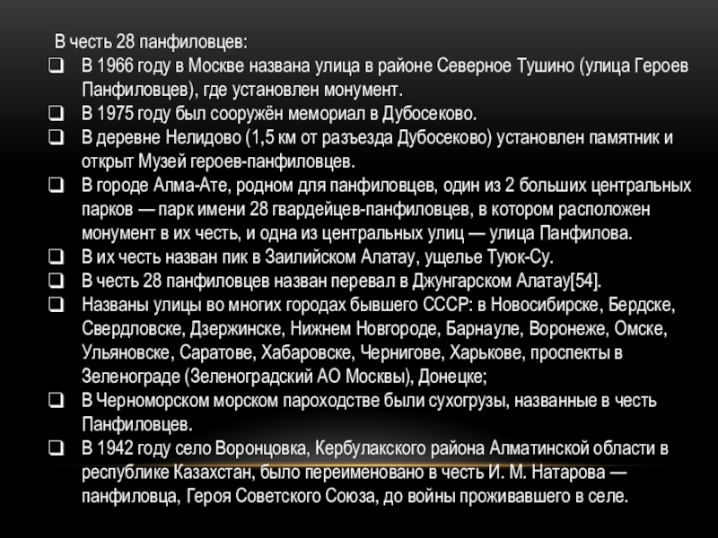 В честь 28 панфиловцев назван перевал в Джунгарском Алатау[54].