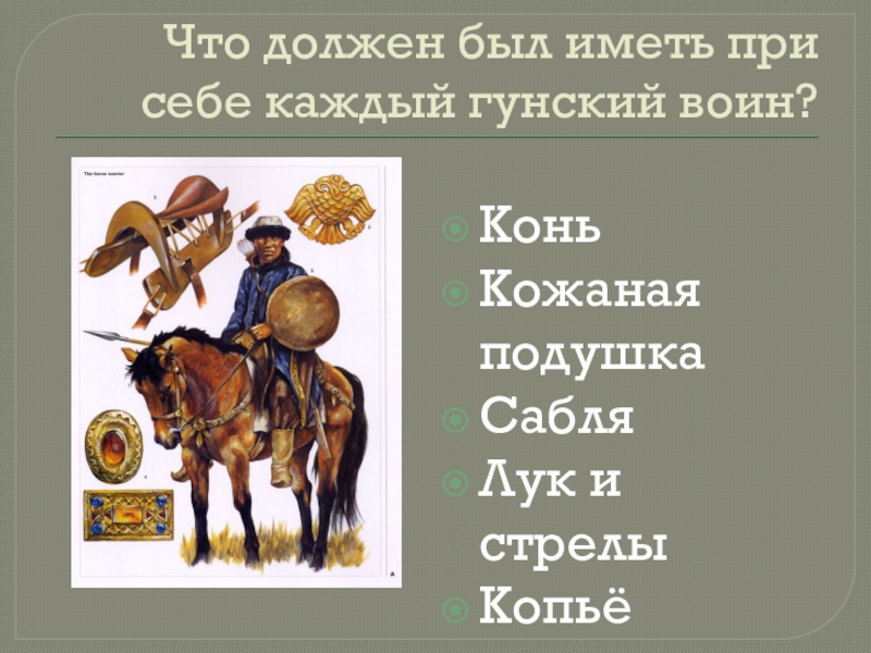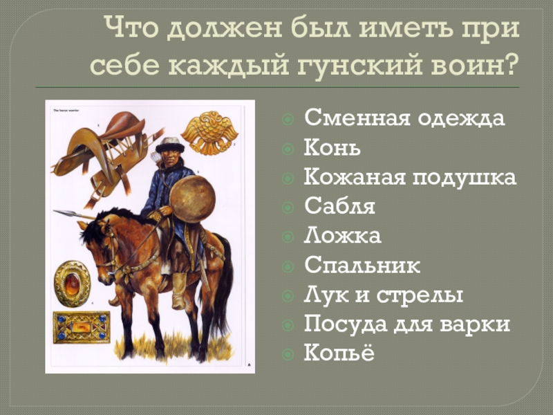 Слайд 6Что должен был иметь при себе каждый гунский воин?