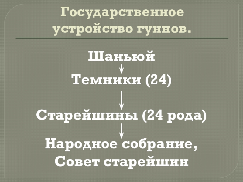 Государственное  устройство гуннов.ШаньюйТемники (24)Старейшины (24 рода)Народное собрание, Совет старейшин