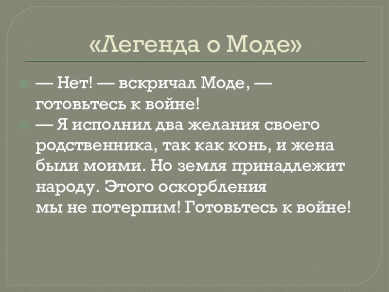 «Легенда о Моде»— Нет! — вскричал Моде, — готовьтесь к войне!— Я исполнил два желания своего родственника, так как конь, и жена были моими.
