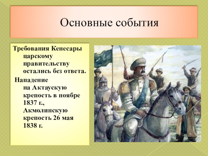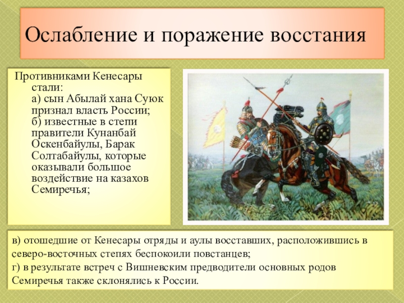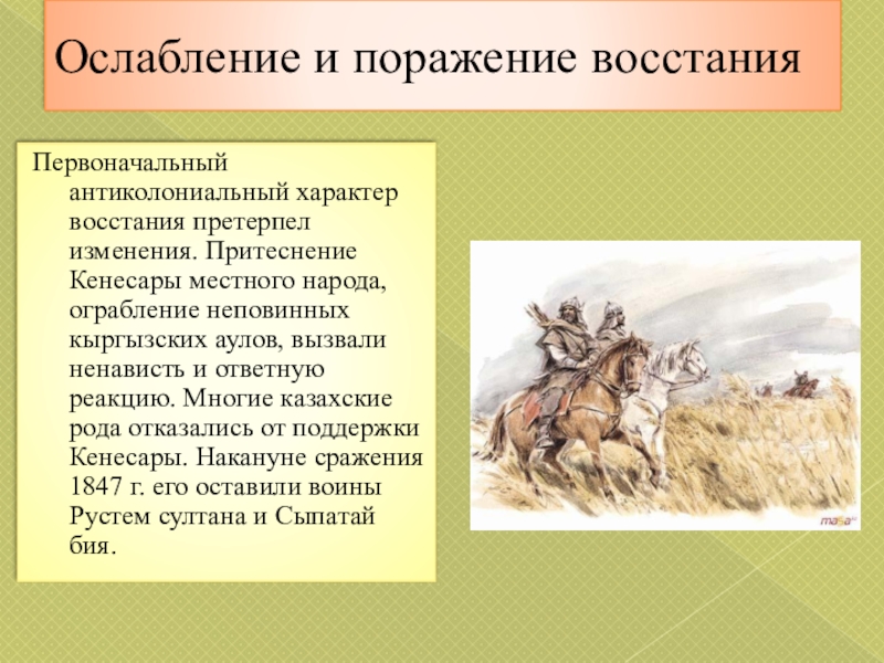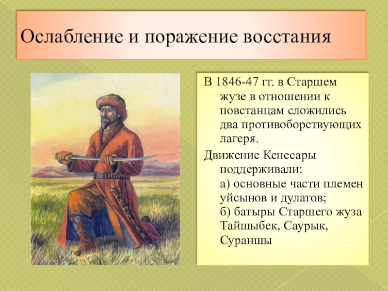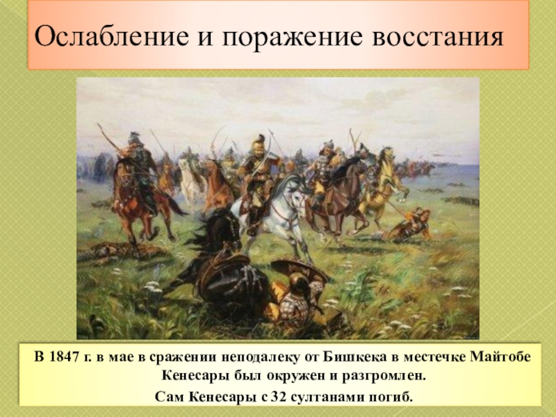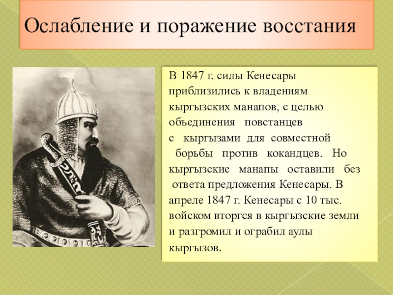 местного народа, ограбление неповинных кыргызских аулов, вызвали ненависть и ответную реакцию. Многие казахские рода отказались от поддержки Кенесары. Накануне сражения 1847 г. его оставили воины Рустем султана и Сыпатай бия.