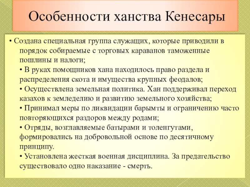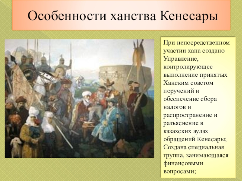 • Осуществлена земельная политика. Хан поддерживал переход казахов к земледелию и развитию земельного хозяйства;