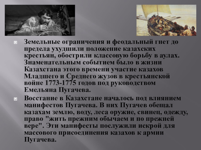 обострили классовую борьбу в аулах. Знаменательным событием было в жизни Казахстана этого времени участие казахов Младшего и Среднего жузов в крестьянской войне 1773-1775 годов под руководством Емельяна Пугачева.