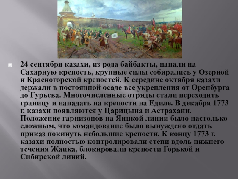Слайд 824 сентября казахи, из рода байбакты, напали на Сахарную крепость, крупные