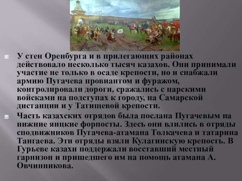 Слайд 11У стен Оренбурга и в прилегающих районах действовало несколько тысяч казахов.