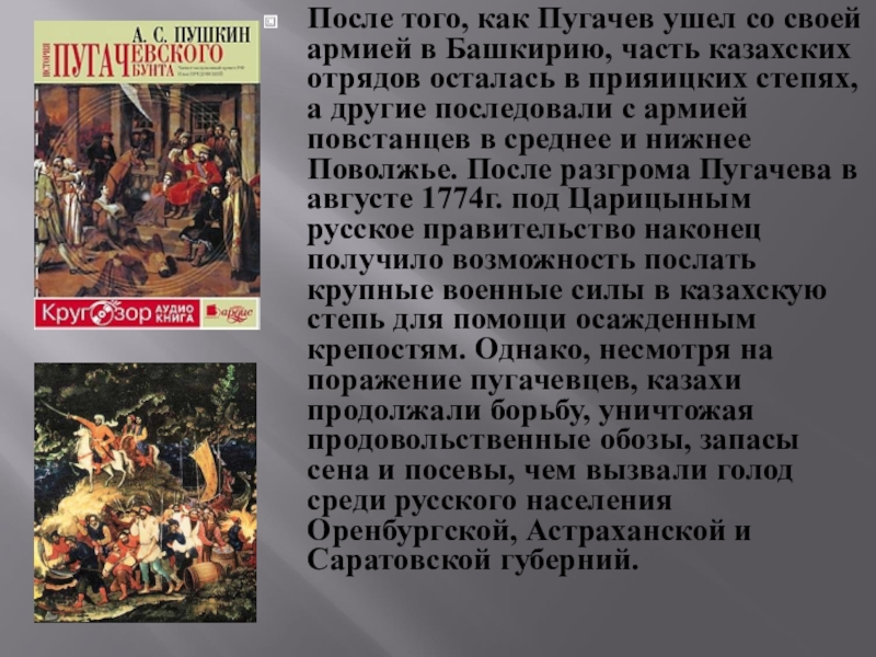 казахских отрядов осталась в прияицких степях, а другие последовали с армией повстанцев в среднее и нижнее Поволжье. После разгрома Пугачева в августе 1774г. под Царицыным русское правительство наконец получило возможность послать крупные военные силы в казахскую степь для помощи осажденным крепостям. Однако, несмотря на поражение пугачевцев, казахи продолжали борьбу, уничтожая продовольственные обозы, запасы сена и посевы, чем вызвали голод среди русского населения Оренбургской, Астраханской и Саратовской губерний.
