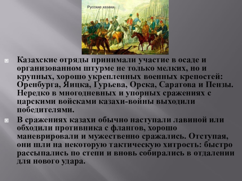 мелких, но и крупных, хорошо укрепленных военных крепостей: Оренбурга, Яицка, Гурьева, Орска, Саратова и Пензы. Нередко в многодневных и упорных сражениях с царскими войсками казахи-войны выходили победителями.