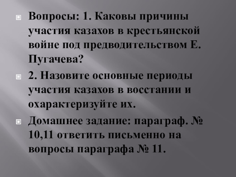 Слайд 17Вопросы: 1. Каковы причины участия казахов в крестьянской войне под предводительством