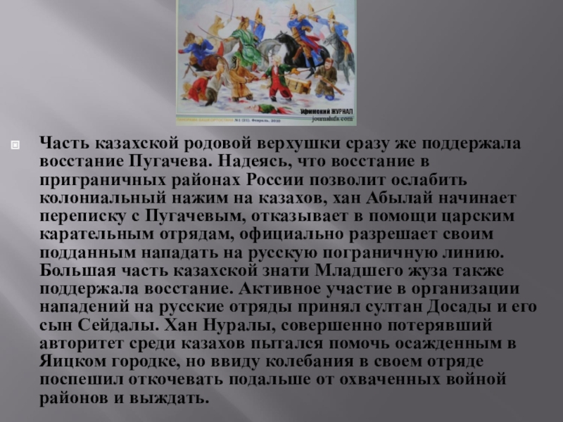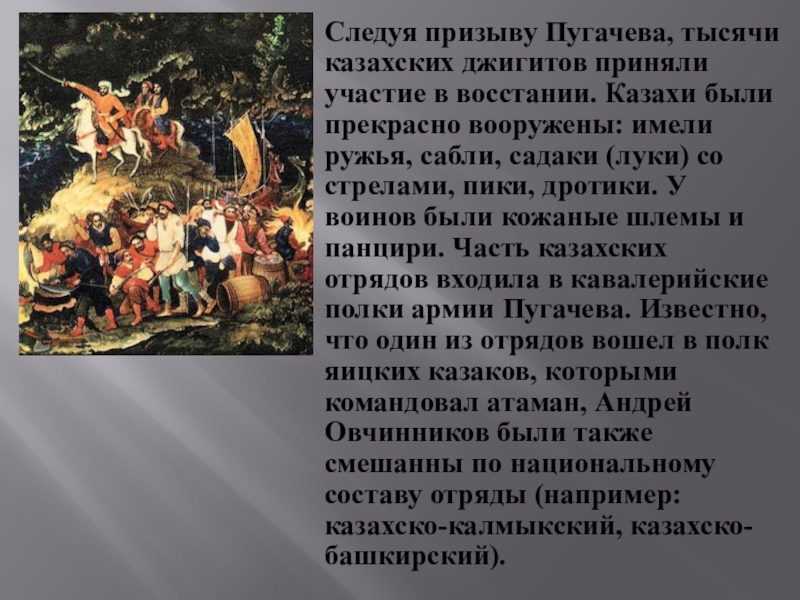 Слайд 7Следуя призыву Пугачева, тысячи казахских джигитов приняли участие в восстании. Казахи