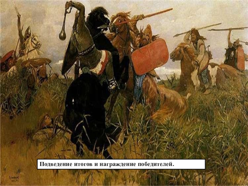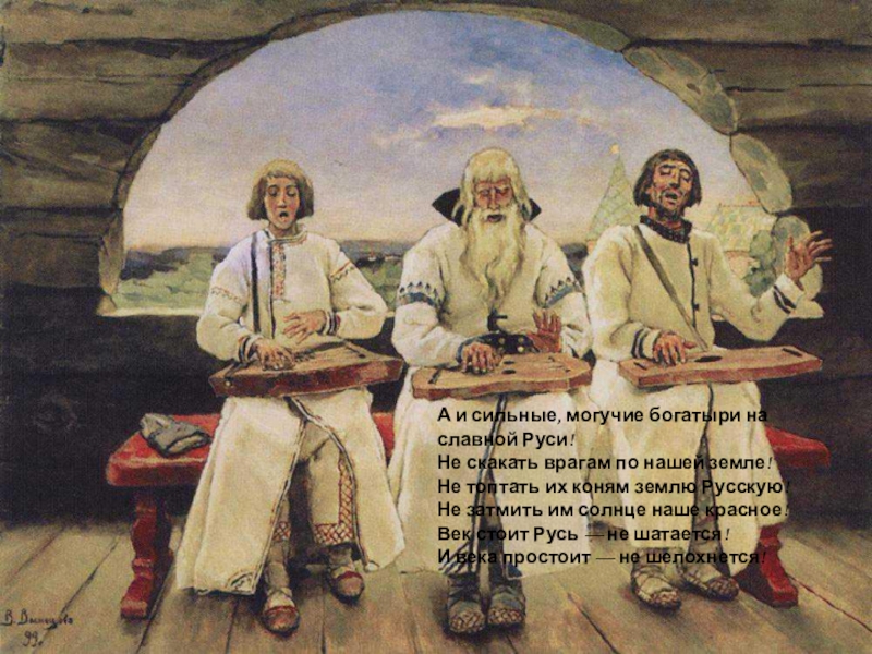 А и сильные, могучие богатыри на славной Руси! Не скакать врагам по нашей земле! Не топтать их