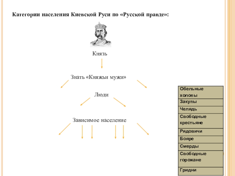 Категории населения Киевской Руси по «Русской правде»:КнязьЗнать «Княжьи мужи»ЛюдиЗависимое население